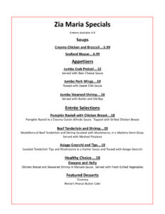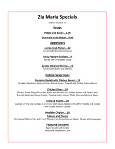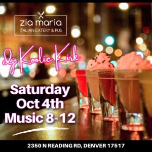 The next time you are craving a delicious Italian (or American) meal or are looking to meet up with friends in a friendly atmosphere, check out Zia Maria Italian Eatery & Pub. Zia’s is a favorite spot for food, drinks, outdoor dining, and live entertainment! Stop in on Saturday nights to get your boogie on with our weekly DJ. or live band! Zia’s provides plenty of free parking and free wi-fi service.
