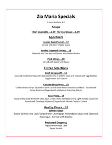 The next time you are craving a delicious Italian (or American) meal or want to meet up with friends in a friendly atmosphere, check out Zia Maria Italian Eatery & Pub. Zia’s is a favorite spot for food, drinks, outdoor dining, and live entertainment! Stop in on Saturday nights to get your boogie on with our weekly DJ. or live band! Zia’s provides plenty of free parking and free wi-fi service.