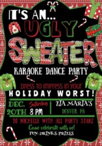 YOU’RE INVITED! UGLY SWEATER PARTY THIS SATURDAY NIGHT DECEMBER 20 KARAOKE WITH ALL PARTY STARZ!!!